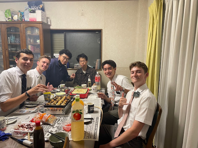 Starting with Monday, we had a pretty chill day... We went to a steakhouse with a member for his birthday and for one of the guys I'm living with's birthday! After that, we went home, and my comp took a FAT nap because he wasn't feeling too hot. After that, we pulled up to Kai's house and had a Takopa! It's a Takoyaki (octopus balls) party! We had a great time and he had bought a bunch of cakes for Elder Seegmiller's birthday, which was so fun!